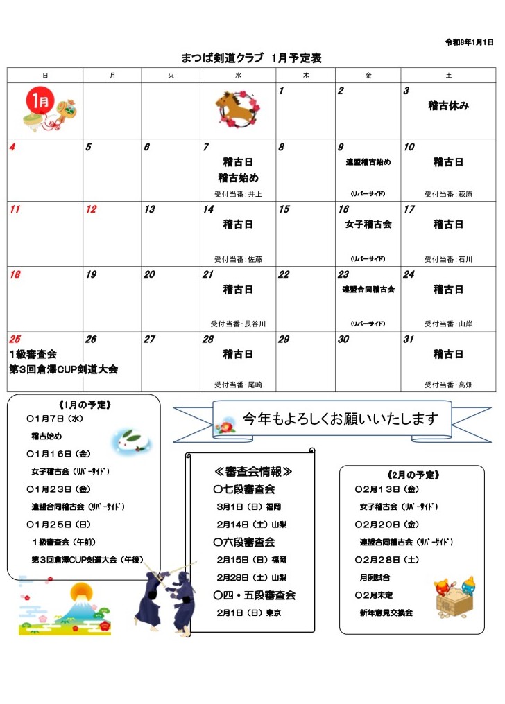 1月の予定表をアップしました(2026.1)